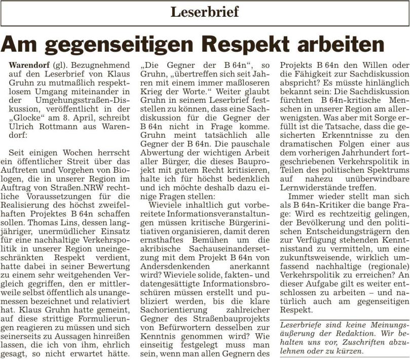 Eigentlich unterstelle ich beiden Seiten die notwendige Achtsamkeit bei ihrem Handeln – wichtiger aber: es sollte nicht aus dem Auge verloren werden, dass die Amphibienpopulation am Schüttenteich durch beide Aktionen dort deutlich weniger beeinträchtigt wird, als durch die geplante B64n, die Bundesstraße mit „Autobahn-Dimensionen“ von Münster nachBielefeld.
